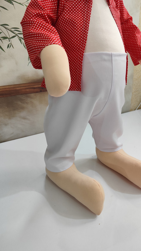 لباس شیک این مدل شامل کت قرمز خالدار و شلوار سفید است که ظاهری جذاب و خاص به آن داده است. همچنین امکان تغییر رنگ لباس طبق سلیقه شما وجود دارد تا عروسکی کاملاً سفارشی و هماهنگ با تم دلخواهتان داشته باشید.