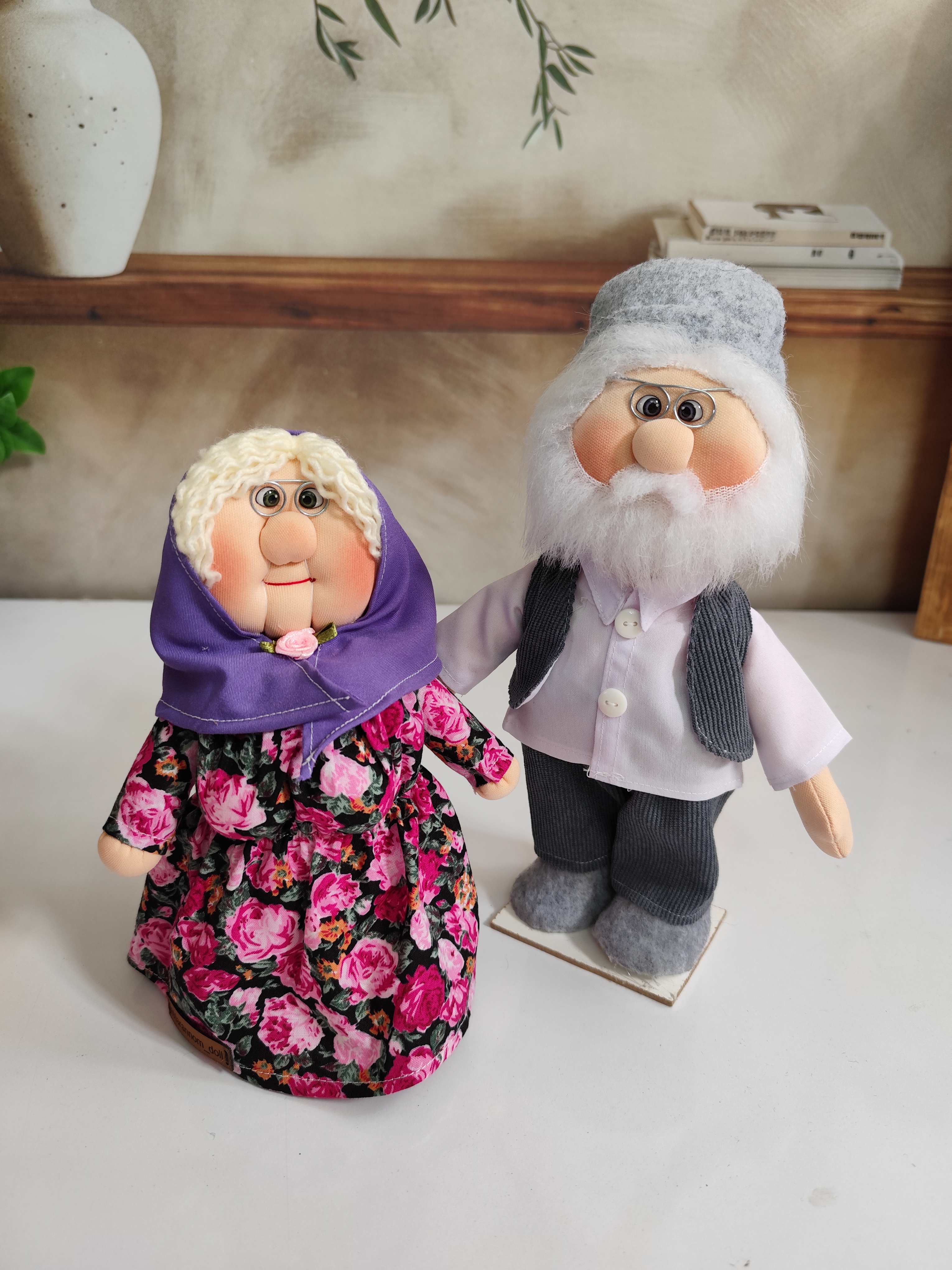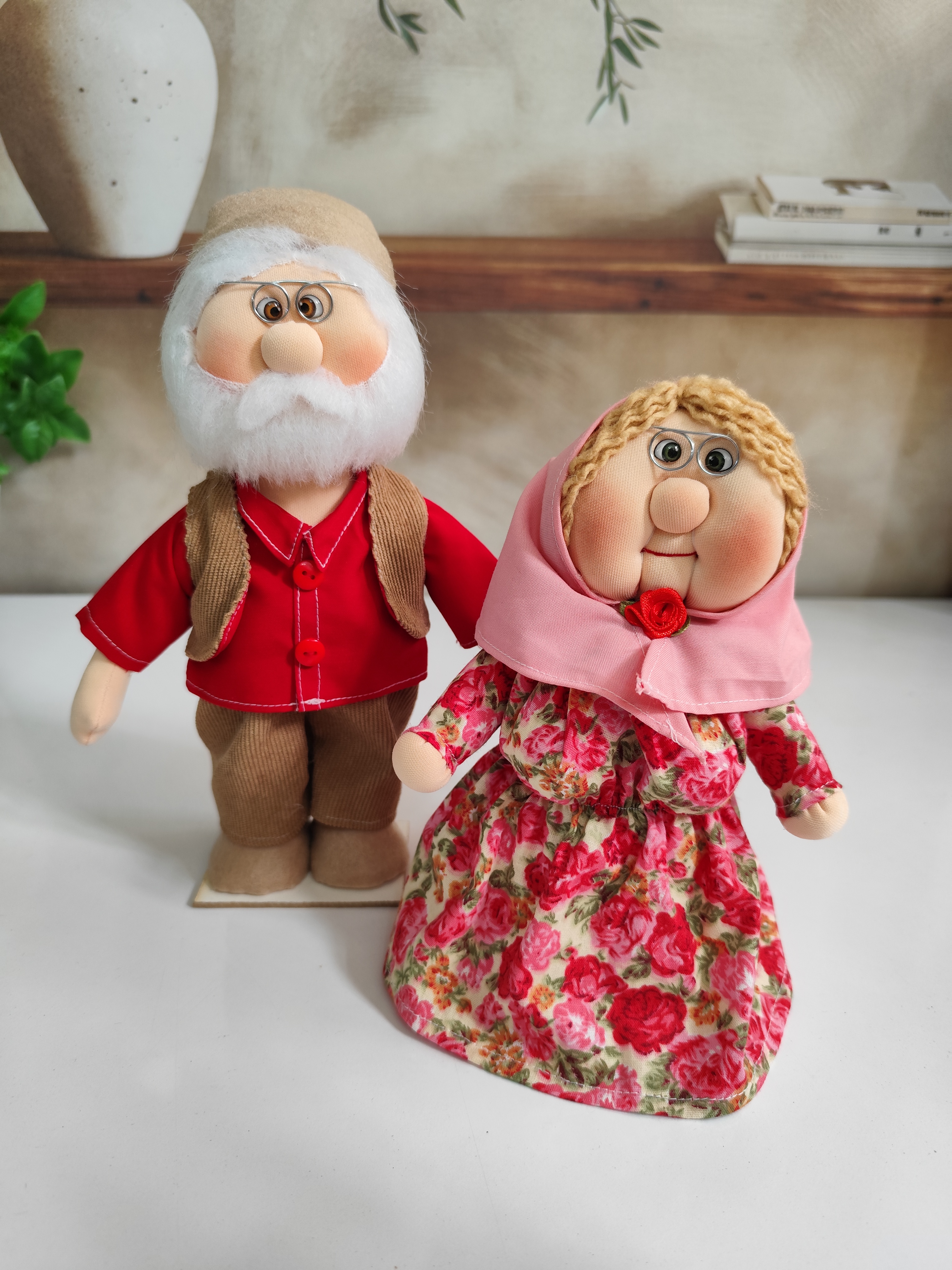 هر دو عروسک در حالت ایستاده طراحی شدن و ظرافت دوخت، چهرهی مهربون و لباسهای سنتی، اونها رو تبدیل به یک هدیهی خاص و دکوری بینظیر کرده.