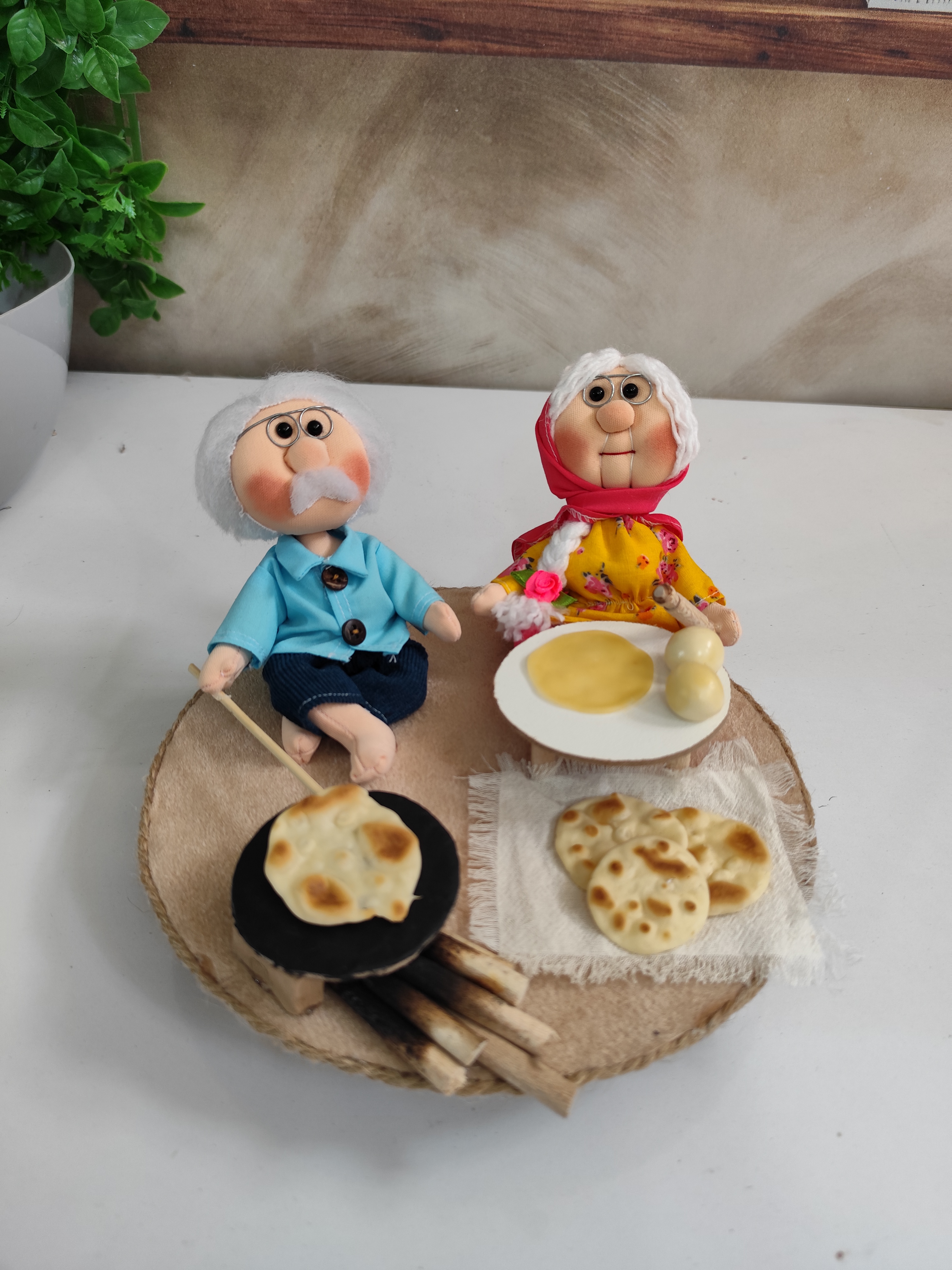 ست عروسک پارچهای دستدوز با تم نانپزی، شامل عروسکها بههمراه اجاق، وردنه و وسایل نانوایی؛ انتخابی خاص برای دکور و هدیه.