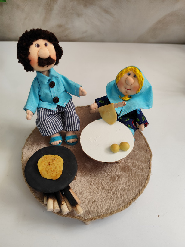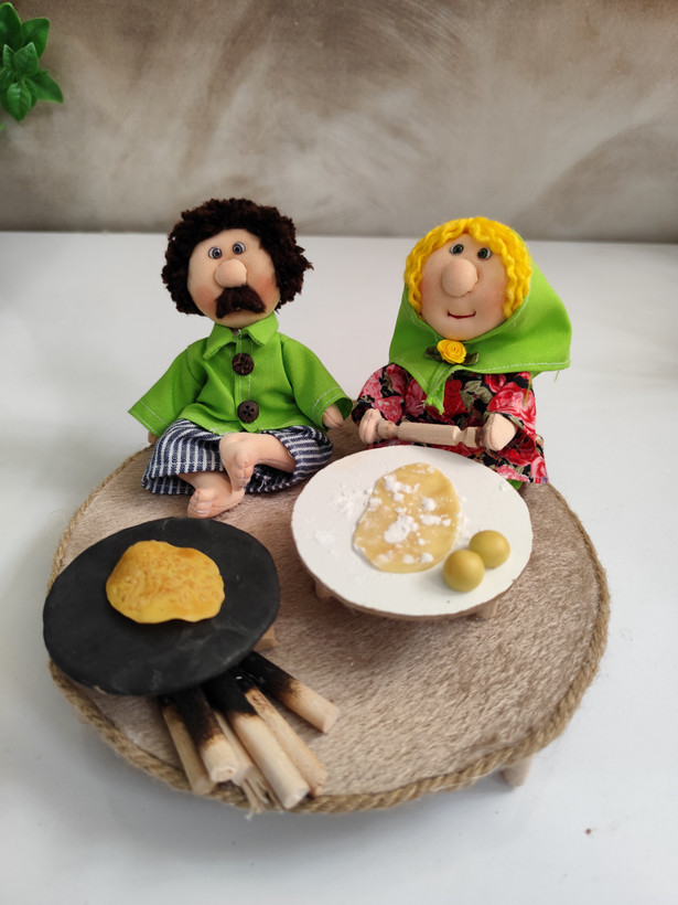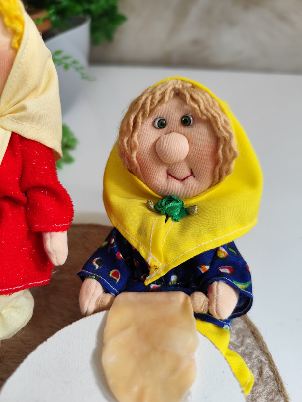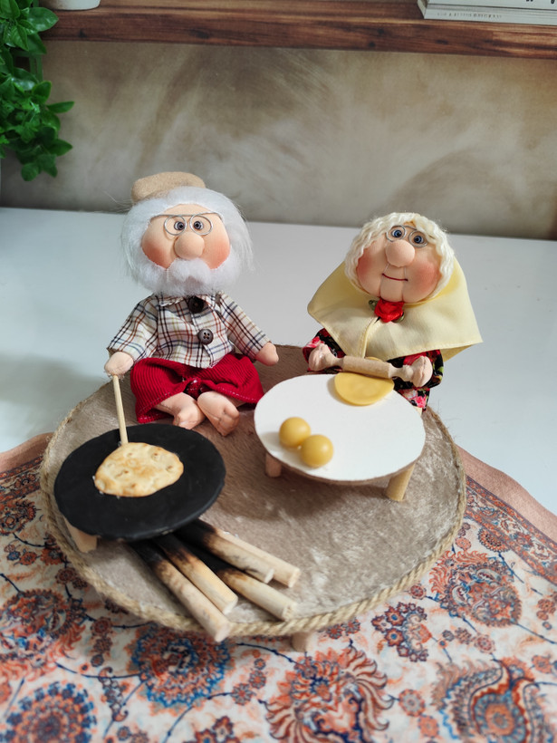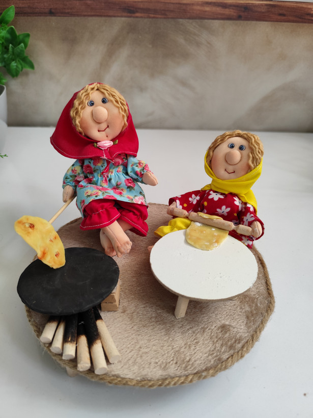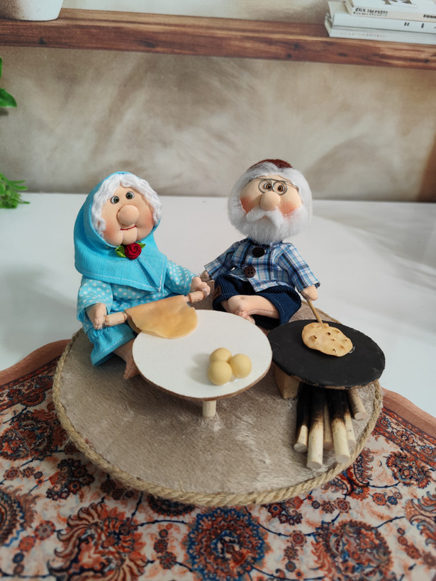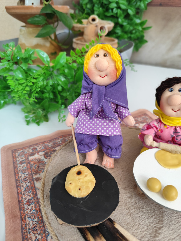 ست عروسک پارچهای دستدوز با تم نانپزی، شامل عروسکها بههمراه اجاق، وردنه و وسایل نانوایی؛ انتخابی خاص برای دکور و هدیه.