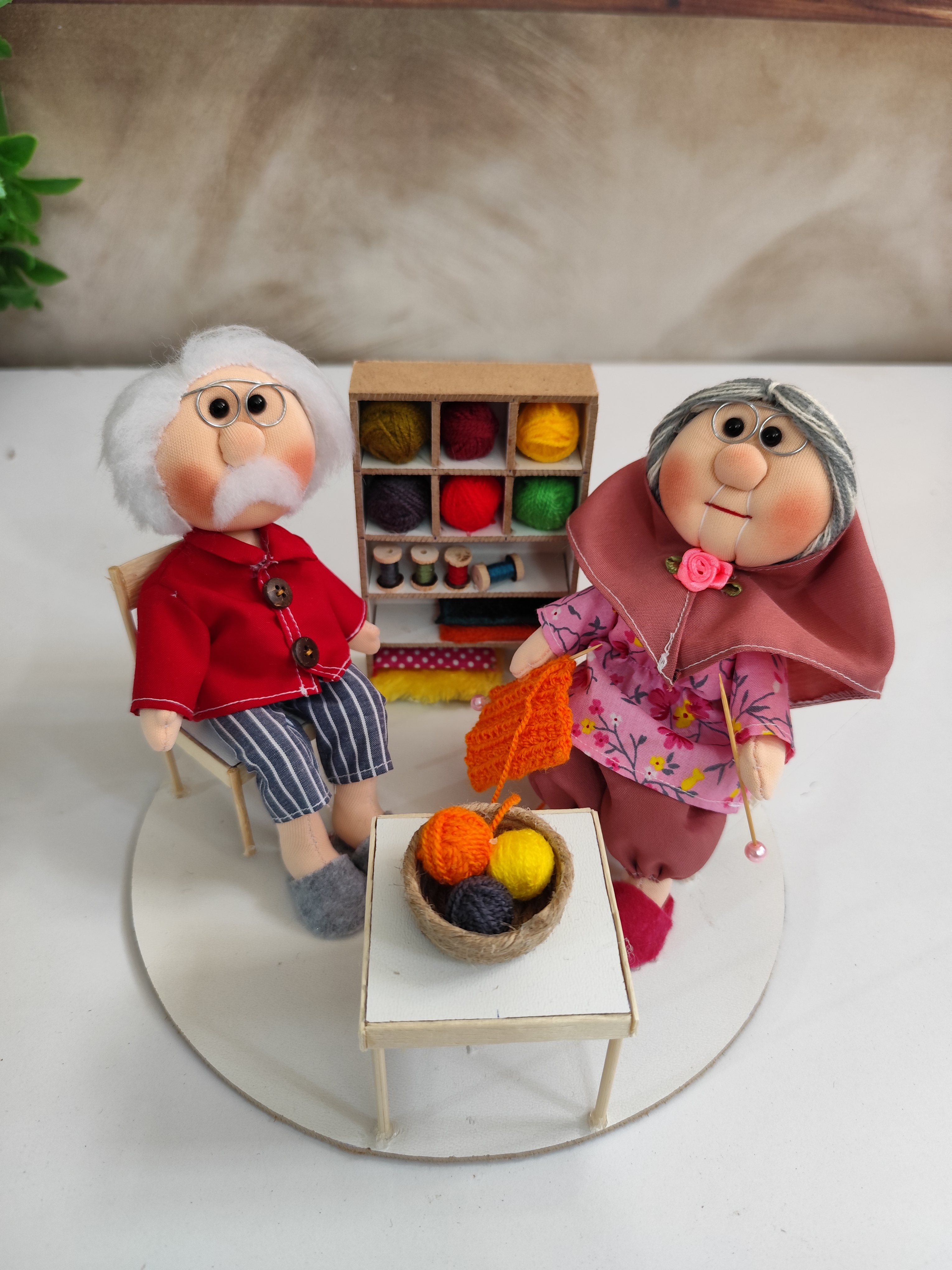 عروسک زوجی ننه جون و آقاجون دستدوز با صندلی چوبی